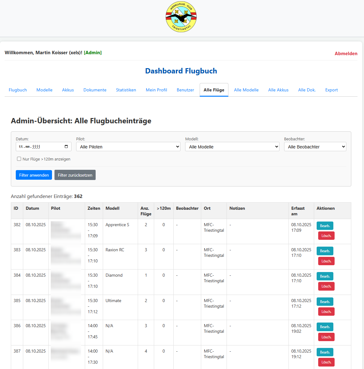 Adminfunktionen: Ansicht "aller" erfasster Daten. Verwalt- und editierbar. (Nur für Admins sichtbar)